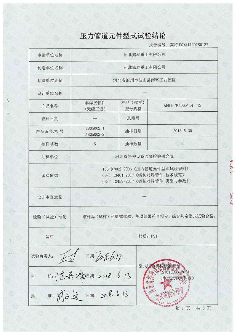 標(biāo)題:特種設(shè)備型式試驗(yàn)報(bào)告(無縫三通)